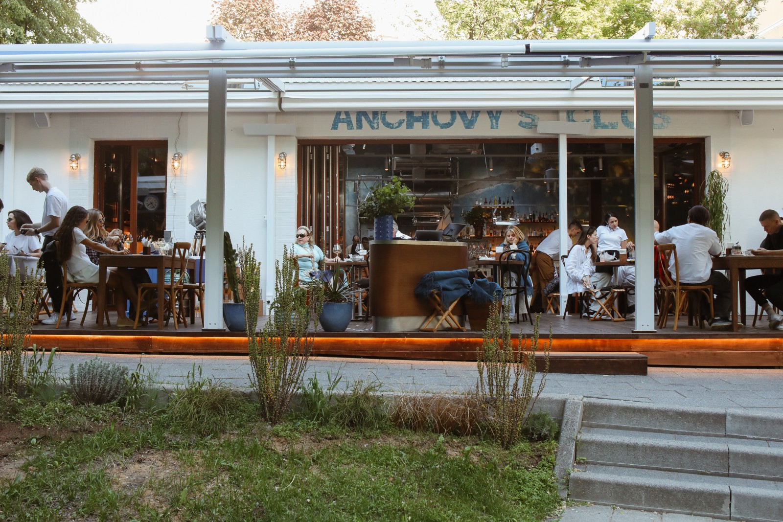 Глянцевые блики лакированного тика, глубокий синий и ослепительный белый, звенящий чистый воздух и по-настоящему курортное настроение. Терраса Anchovy’s Club изящным пирсом врезалась в зеленый сквер, каскадом спускающийся к Трубной улице.