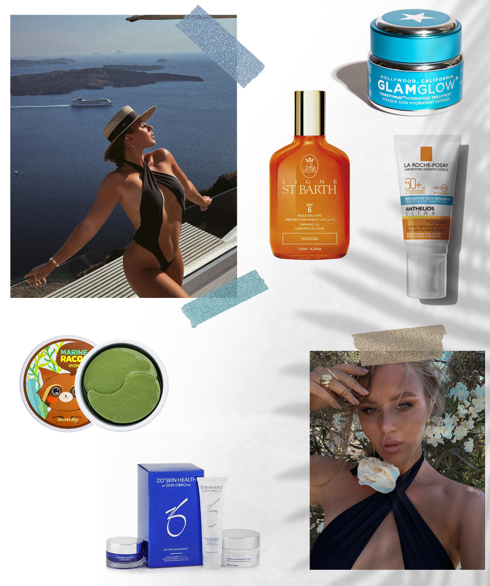В моей косметичке для путешествий всегда есть средства для очищения. На Миконосе это было особенно необходимо — там много солнца, кожа постоянно потеет и на нее оседает пыль, особенно если ездить в кабриолете. Также косметика забивает поры. Сейчас я использую серию OBAGI для комбинированной кожи. Сначала наношу скраб Exfoliating Polish, который больше напоминает гель с гранулами. Он качественно очищает и скрабирует кожу, еще нравится его легкая и воздушная текстура. Также обязательно протираю лицо тоником, а в качестве завершающего штриха — увлажняющий крем. Кроме этого, один раз в неделю использую щадящий скраб для лица, который делает кожу чистой до «хруста». А после солнечных ванн делаю маски с алоэ вера, чтобы успокоить кожу.