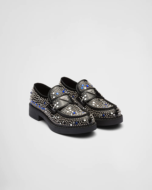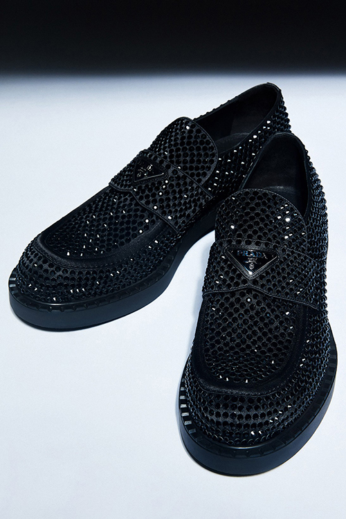 К Новому году Миучча Прада и Раф Симонс представили обновленную модель лоферов. Черную кожу в этот раз украсили металлическими заклепками и стразами, которые отсылают нас к сапфирам. Классический логотип Prada на металлической пластине – на прежнем месте!