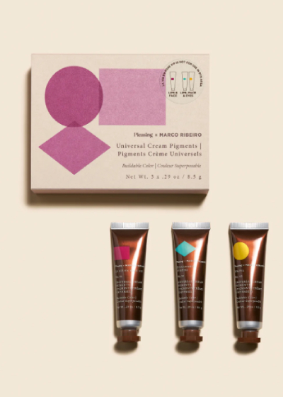 2) три универсальных пигмента (голубой, желтый и розовый), которые можно наносить на веки, щеки или губы;