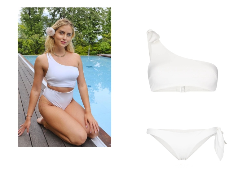 Итальянский блогер Валентина Ферраньи выбирает белое бикини с лифом на одно плечо из коллекции H&M. Но еще не менее интересный вариант с бантами на одной стороне мы увидели у Zimmermann.
