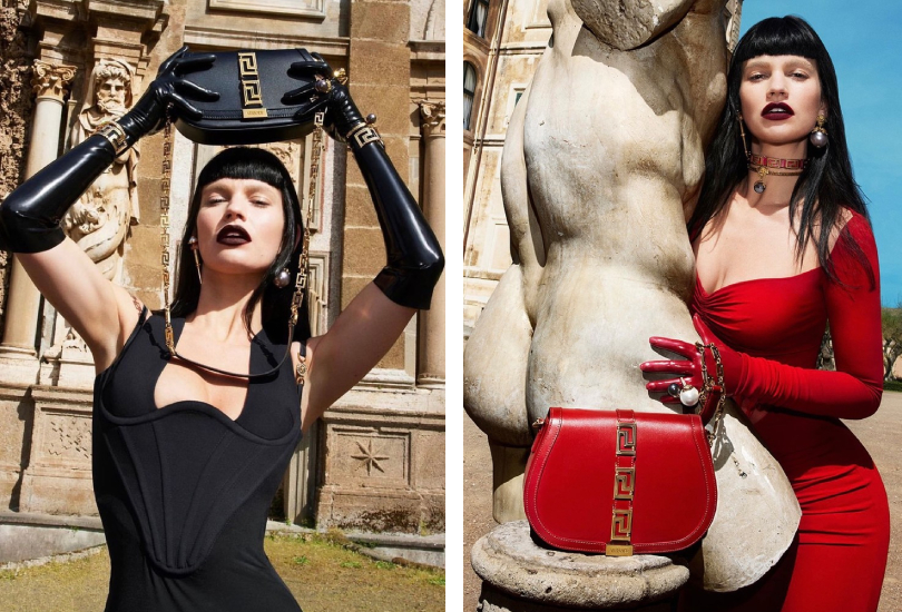 «Хамелеон», «мастер перевоплощений», — так сейчас называют Лили Джеймс. Сначала актриса запомнилась образом Золушки в одноименном фильме, потом поразила сходством с Памелой Андерсон для сериала «Пэм и Томми» (смотрите фото здесь), а теперь мы с трудом узнали ее в новом кампейне Versace. На фотографиях знаменитость позирует с иссиня-черными волосами и короткой челкой, также визажисты отбелили ее брови, а на губы нанесли темно-коричневую помаду. На одном кадре Лили предстала в черном платье и высоких кожаных перчатках, а на другом — в красном наряде с длинным рукавом, но тоже в перчатках в тон. И везде она демонстрирует сумку Versace Greca Goddess в двух оттенках — черном и красном.