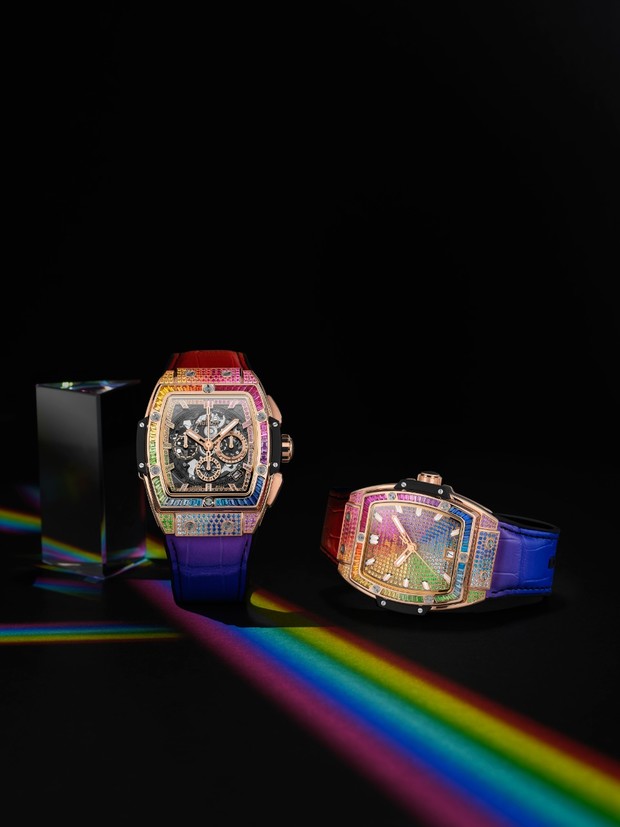 Часы выполнены из розового золота. Модель покрупнее украшена 220 переливающимися драгоценными камнями, а та, что поменьше, образует переливы цвета за счет палитры из 657 рубинов, сапфиров, топазов, цаворитов и аметистов. Ремешок из кожи аллигатора вторит настроению циферблата и тоже повторяет градиент.