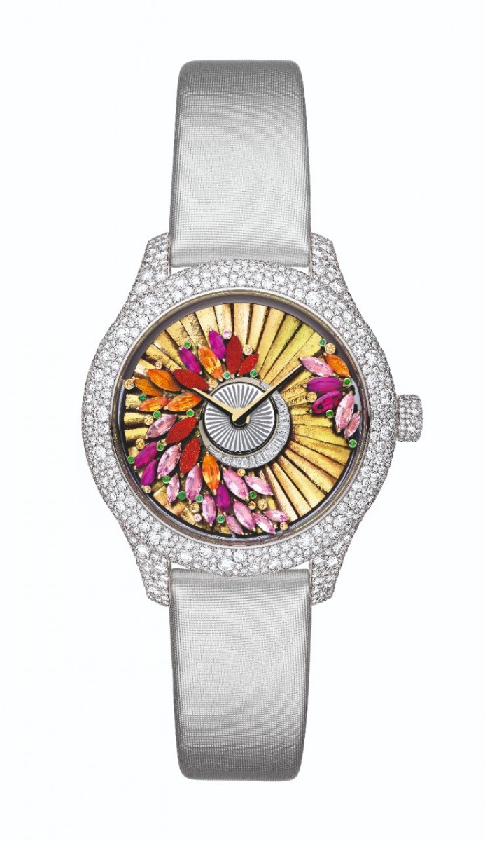 Перламутровый циферблат словно олицетворяет собой Солнце, вокруг которого вращаются планеты в виде цитринов, аметистов, перидотов, топазов и родолитов. А рядом — туманности и созвездия из 80-ти бриллиантов.