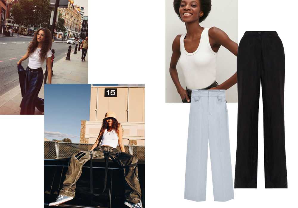 По часовой стрелке: топ молочного цвета 2Mood, 3 980 руб.; прямые брюки с резинкой Studio29, 5 900 руб.; широкие костюмные брюки Lime, 4 999 руб.