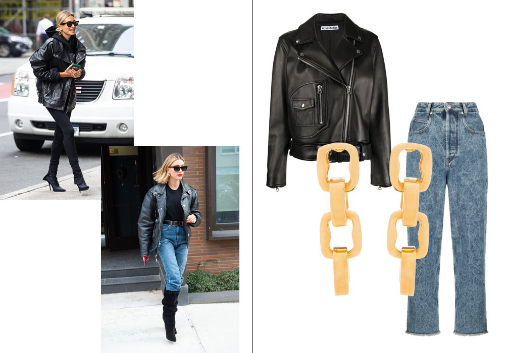 Хейли носит оверсайз-косухи с джинсами и высокими сапогами на каблуках. Как аксессуар – алая помада и массивные серьги.