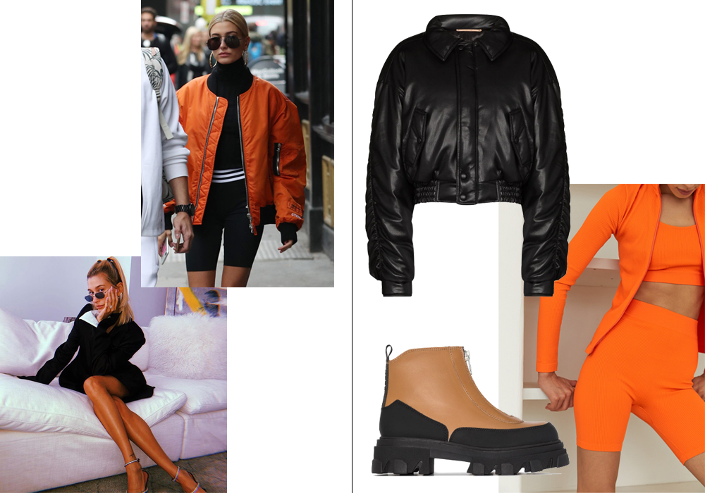 Куртка-бомбер Aida, 50 200 руб., Nanushka; велосипедки Belle You, 2 989 руб.; ботинки на платформе Ganni, 28 895 руб.