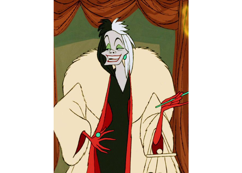 Первый вариант – в кадре из фильма героиня показана в начале своей жизни в Лондоне, когда она еще не разводила собак ради одежды. Второй – режиссер изменил сценарий и подстроил образ злодейки под современную реальность, когда носить мех считается моветоном. Зато натуральная кожа — остро, стильно, гармонично для отрицательной героини, при этом сохранена суть конфликта.