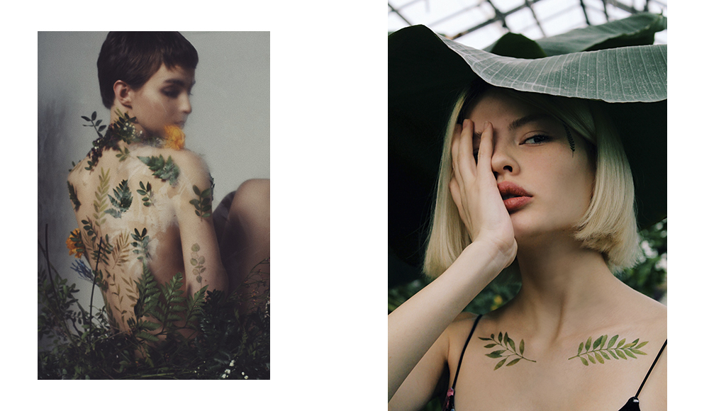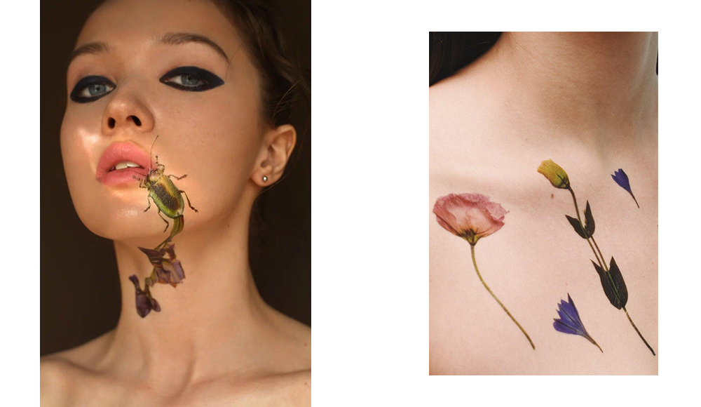 «Мы заказали крымскую лаванду, засушили ее и сделали фото через стекло. Та же история с сухоцветами: это настоящий гербарий. На коже они выглядят, как живые цветы, – заметна каждая деталь, до тончайших прожилок на лепестках».