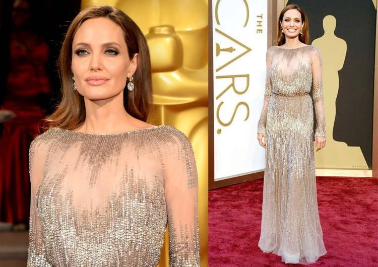 Чаще всего Анджелина отдает предпочтение макияжу с акцентом на губы и черному цвету в одежде. На церемонии вручения «Оскар» актриса решила изменить принципам, отдав предпочтение мерцающему платью от Elie Saab, прямым волосам и помаде телесного оттенка. Получилось отлично!