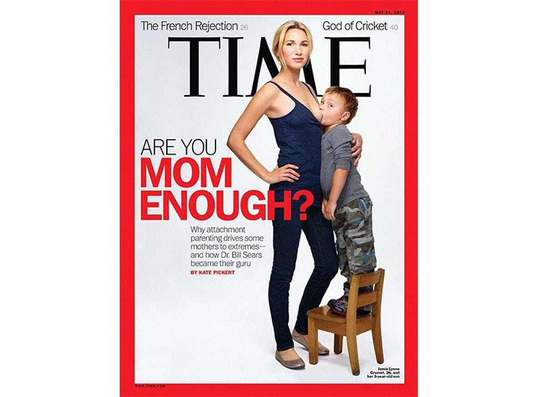 Обложка Time 2012 года сопровождалась тематической статьей о докторе Билле Сирсе и его идеях о воспитании привязанности. Изображение было спорным: мать, кормящая грудью взрослого мальчика. Многие считали оскорбительной фотографию 26-летней матери Джейми Линн Грумет, кормящей трехлетнего сына. Всего за 24 часа после выхода обложка вызвала такую онлайн-дискуссию и споры, что 18 000 комментариев обрушили сайт издания.