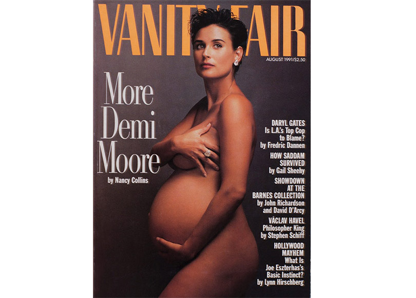 Очень беременная и очень раздетая Деми Мур попала на обложку Vanity Fair в 1991 году. Культовое изображение Мур на седьмом месяце беременности было снято фотографом Энни Лейбовиц. Обратная реакция и возмущение появились очень быстро. Многие супермаркеты даже отказывались продавать журнал. В некоторых местах, где продавался Vanity Fair в тот месяц, глянец путали с Playboy и пытались скрыть. Основатель и генеральный директор Women in the World Тина Браун не ожидала, что обложка вызовет такой ажиотаж. «Я была просто потрясена этой реакцией. Я помню, как опубликовала ее в PR-отделе «Vanity Fair». Я не знала, что это станет сенсацией для СМИ, для каждого радио, телевидения и газеты – не только в Америке, но и во всем мире».